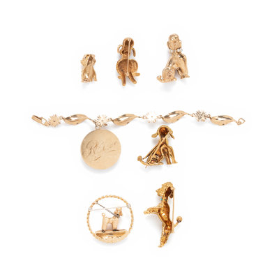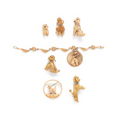 Consisting of six poodle brooches and a bracelet containing four diamonds with a poodle charm. Bracelet: 6 3/4 inches long.
