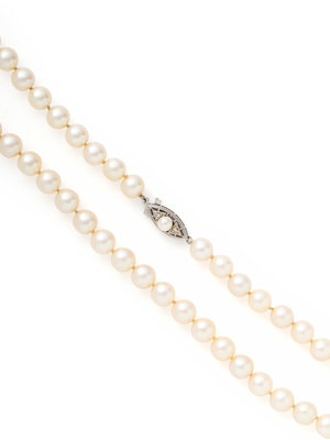 Containing pearls measuring approxiamtely 7.00 mm in diameter, strung knotted with a white gold clasp. 14 1/2 inches long.