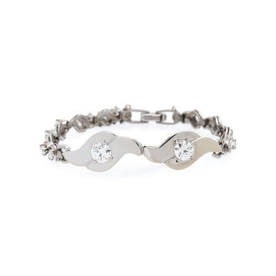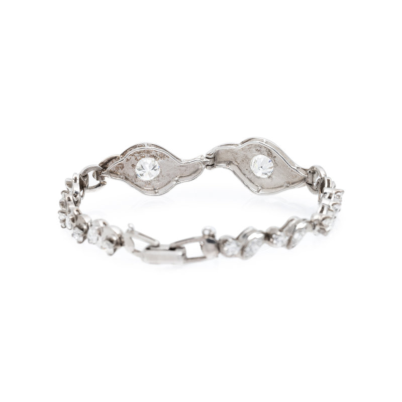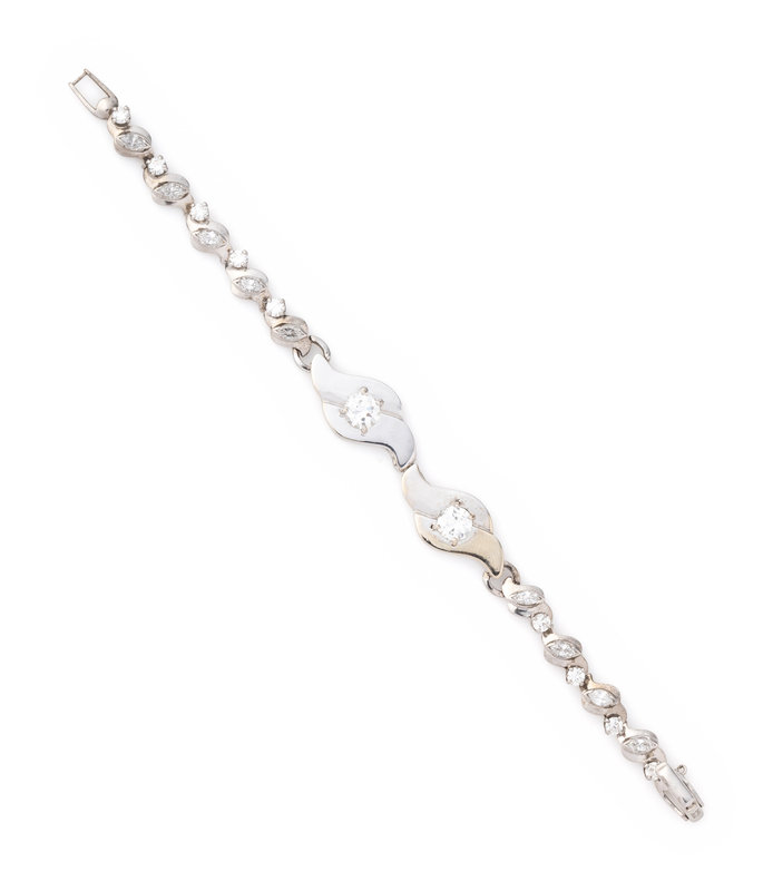 Containing two old European cut diamonds weighing approximately 1.60 carats total, nine marquise and nine round brilliant cut diamonds weighing approximately 2.05 carats total. 6 5/8 inches long.
