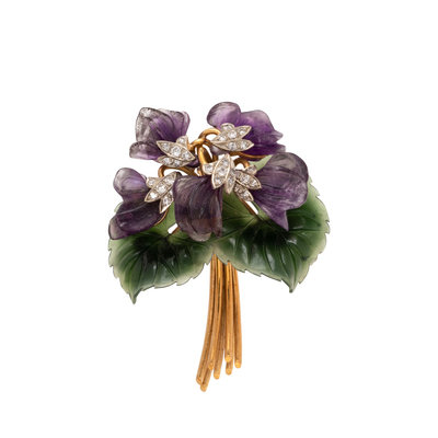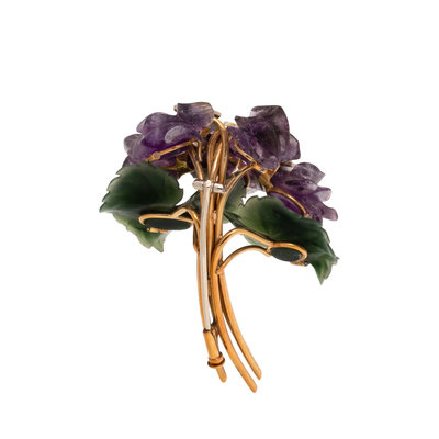 Containing carved amethyst petals, carved green hardstone leaves and white gold detail containing 30 round brilliant and single cut diamonds. Mounted in yellow gold. 2 1/4 x 1 3/4 inches.