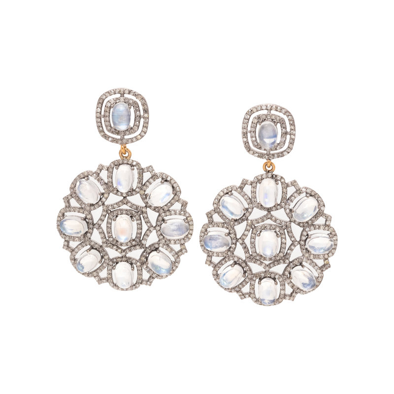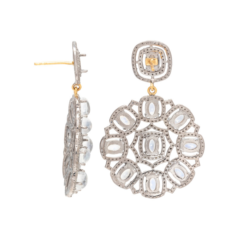 Containing 20 oval cabochon moonstones and numerous single cut diamonds. Mounted in silver with yellow gold posts. 1 3/4 inches long.