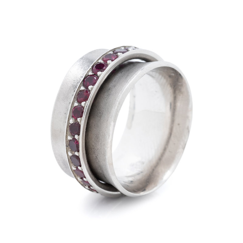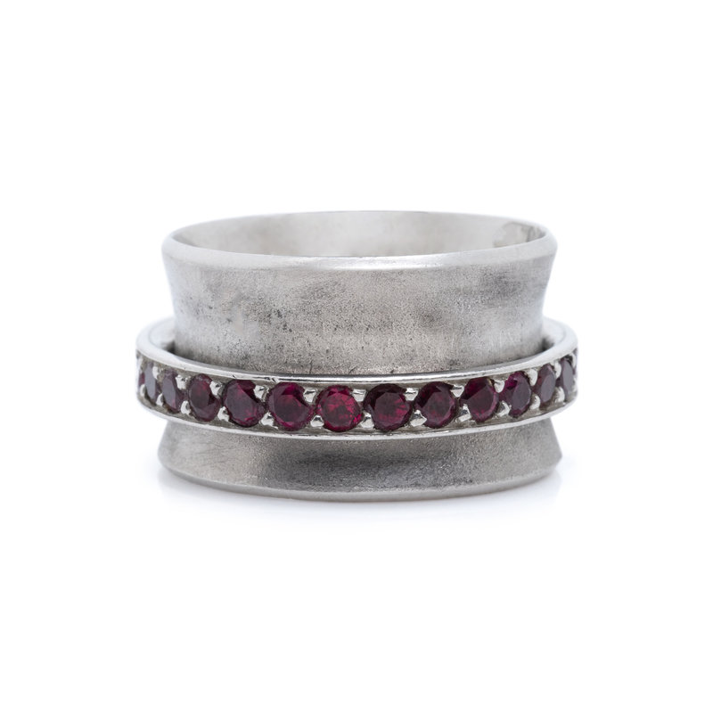Consisting of a curved brushed platinum band with 'orbiting' ruby eternity band. Ring size 7.
