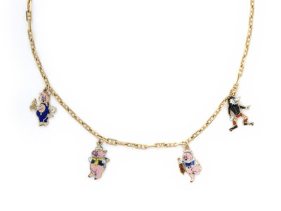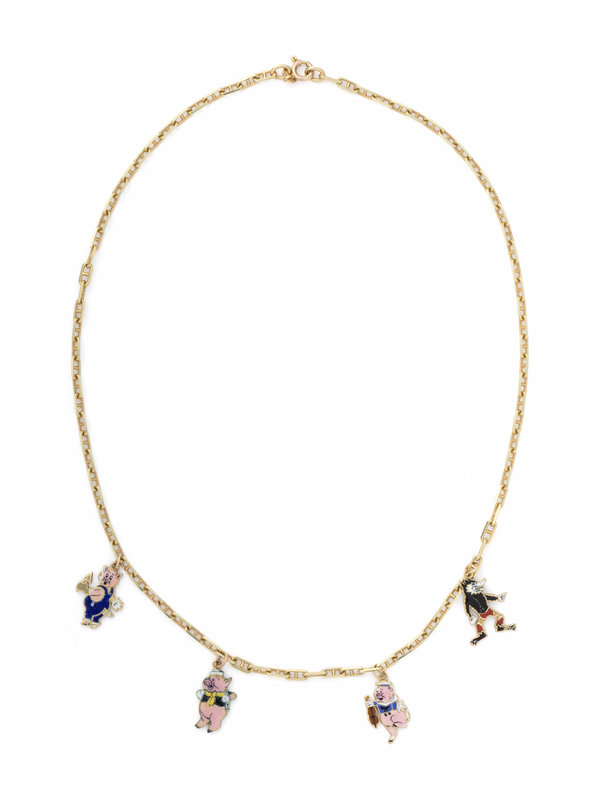 YELLOW GOLD AND ENAMEL 'THREE LITTLE PIGS' CHARM NECKLACE