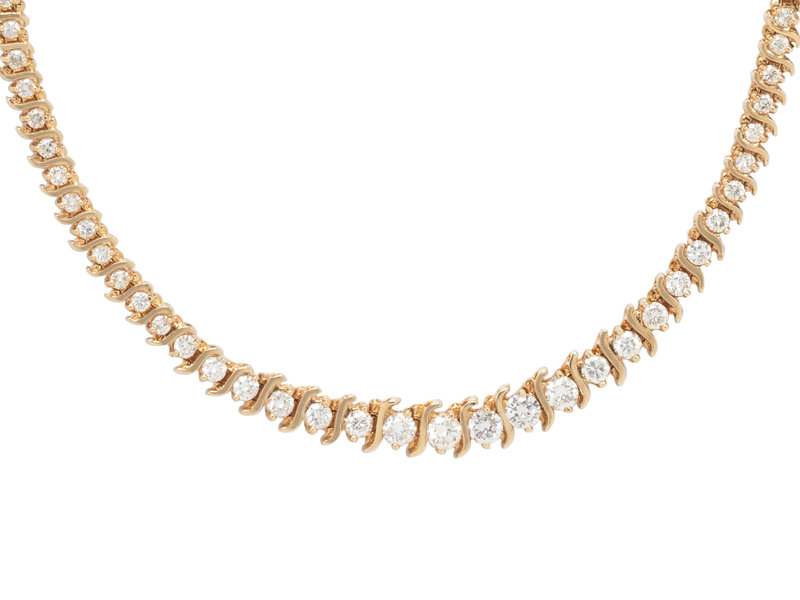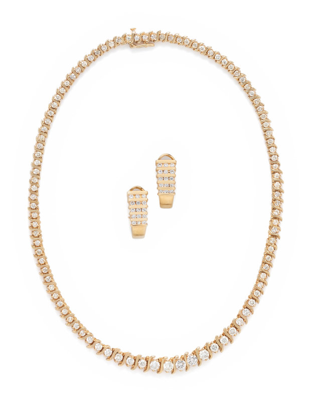 Consisting of a necklace containing numerous round brilliant cut diamonds weighing approximately 8.00-9.00 carats total, together with a pair of earclips containing 30 round brilliant cut diamonds weighing approximately 1.20 carats total, posts with clip backs. Necklace: 15 inches long. Earclips: 3/4 inch long.
