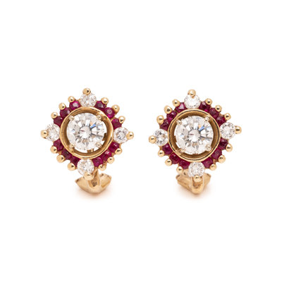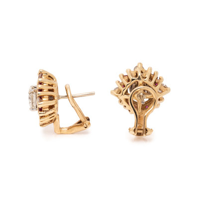 Containing two round brilliant cut diamonds weighing approximately 1.40 carats total, eight round brilliant cut diamonds and 24 round mixed cut rubies, posts with clip backs. Mounted in yellow gold. 5/8 inch long.