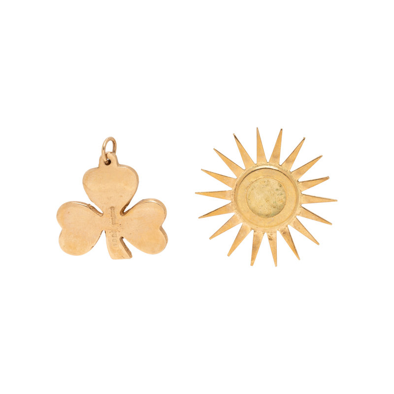 Consisting of a sun element and a clover charm. 1 inch long.
