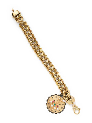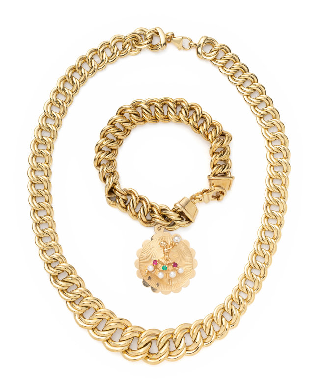 Consisting of a graduating double curb link chain necklace, together with a double curb link bracelet suspending a ballerina disc charm with pearls and gemstones. Necklace: 17 1/4 inches long. Bracelet: 7 1/2 inches long.