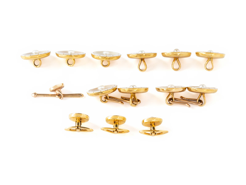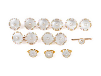 Consisting of a pair of cufflinks, four shirt studs and six buttons with mother-of-pearl, white enamel surround and seed pearls. Mounted in yellow gold.