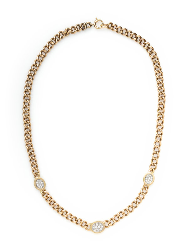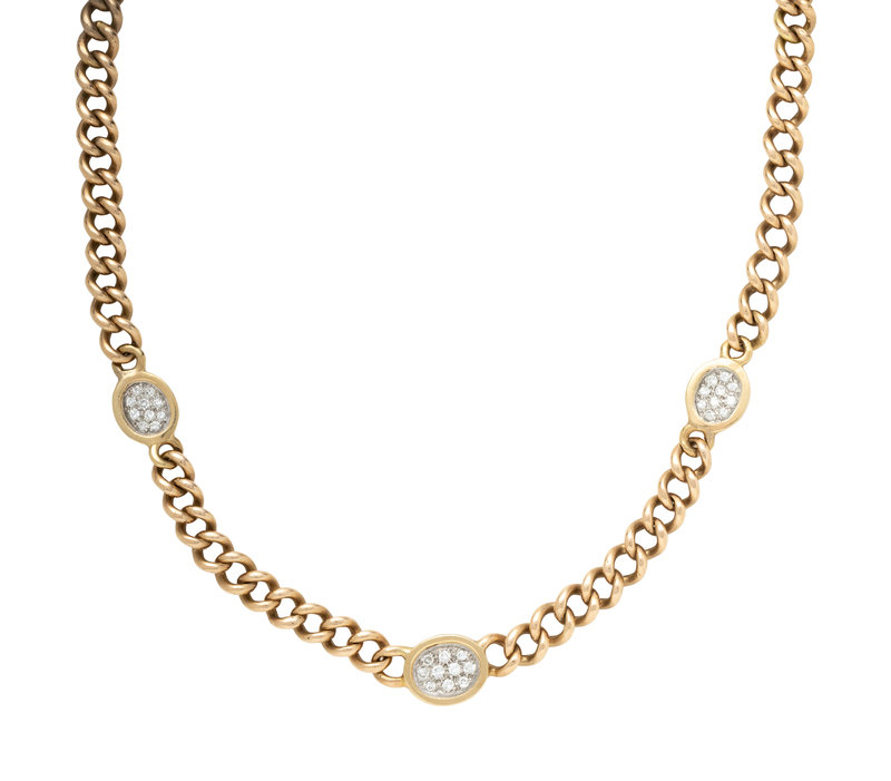 Consisting of a curb link chain measuring approximately 6.50 mm wide, with three stations containing numerous round brilliant cut diamonds weighing approximately 0.70 carat total. 18 inches long.