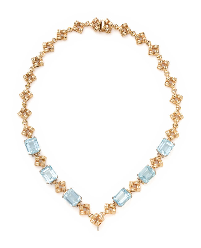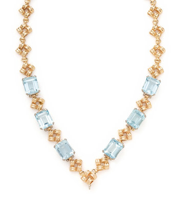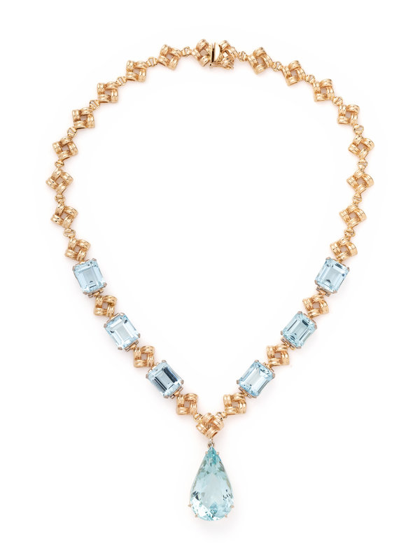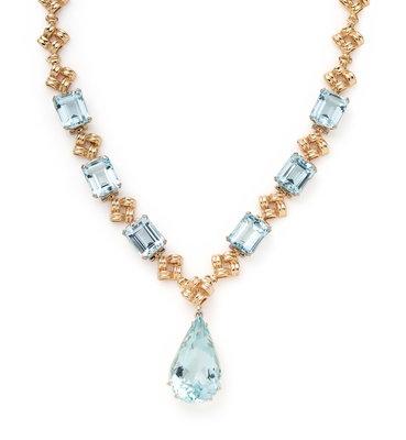 Containing six emerald cut aquamarines measuring approximately 12.10 x 10.00 x 7.00 mm, with removable drop containing one pear mixed cut aquamarine measuring approximately 29.00 x 17.30 x 11.75 mm. 16 1/2 inches long.
