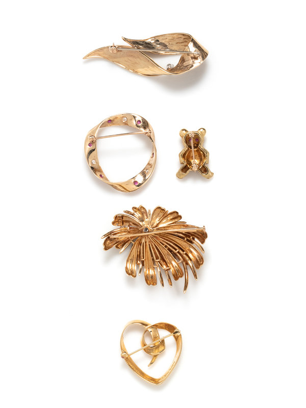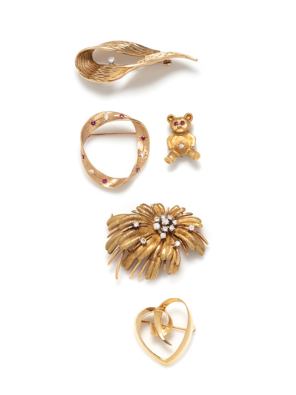 Consisting of a Paloma Picasso for Tiffany & Co. heart brooch with box, a Tiffany & Co. diamond and ruby teddy bear brooch, a diamond and ruby circle brooch, a diamond flower brooch and a Dan Frere abstract diamond brooch.
