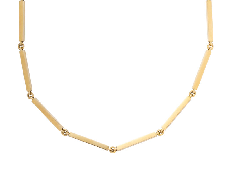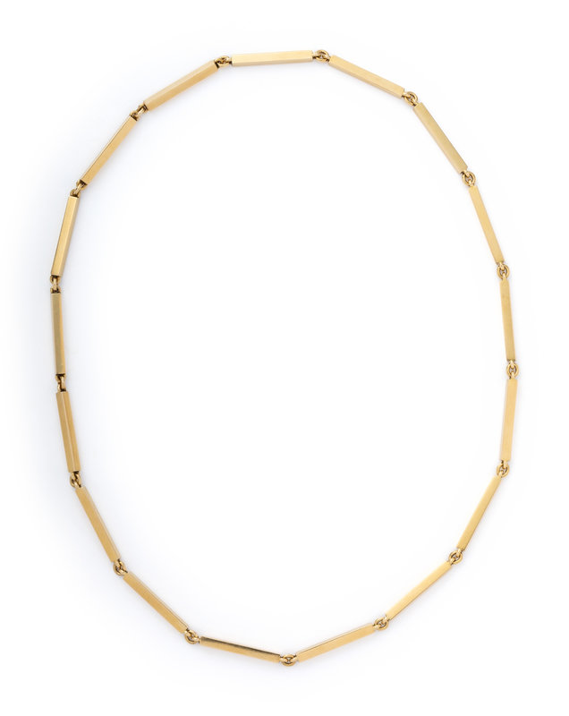 Consisting of elongated rectangular links measuring approximately 4.00 mm wide. 27 inches long.
