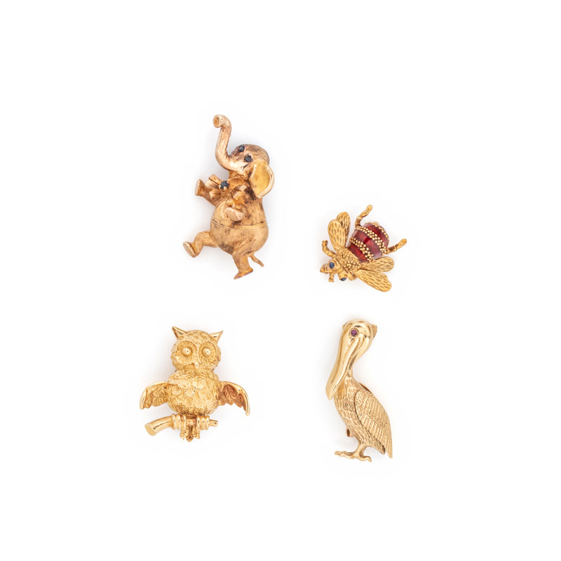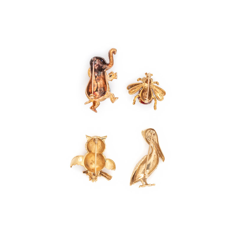 Consisting of an enamel bee brooch, an elephant brooch, a pelican brooch and an owl brooch.