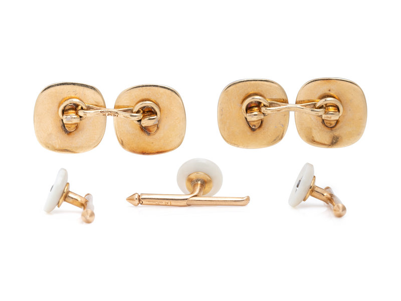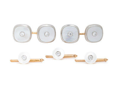 Consisting of a pair of cufflinks and three shirt studs containing mother-of-pearl plaques and seven old European cut diamonds. Mounted in platinum-topped gold.