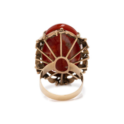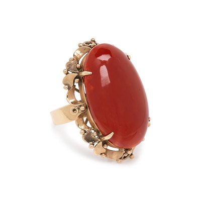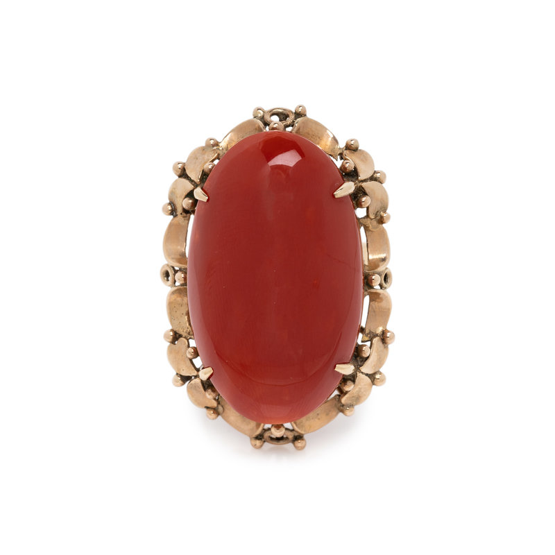 Containing one oval coral cabochon measuring approximately 28.00 x 17.00 mm. Ring size 6 3/4.