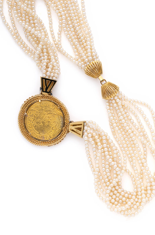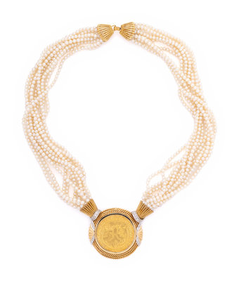 Consisting of a central yellow gold section containing one Spanish excelente coin and 22 single cut diamonds, suspended from 10 strands of seed pearl strands. 14 1/2-15 1/2 inches long.