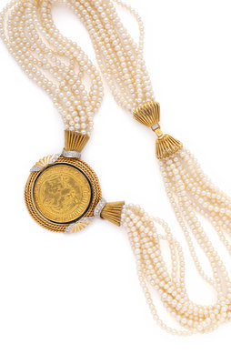 YELLOW GOLD, COIN, DIAMOND AND SEED PEARL NECKLACE