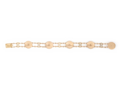 Consisting of circular enamel flag links with engraved letters on the reverse spelling 'RENEE'. 7 1/4 inches long.