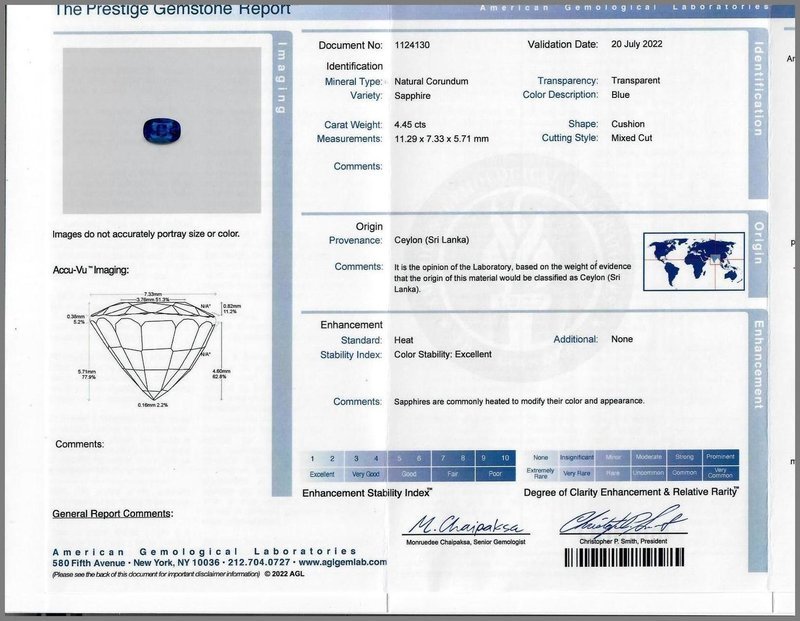 AGL, 2022, Report No. 1124130, 4.45 carats, Natural Corundum, Sapphire, Ceylon (Sri Lanka), Heated