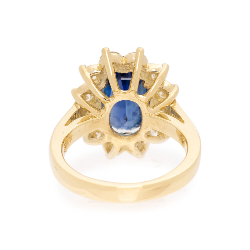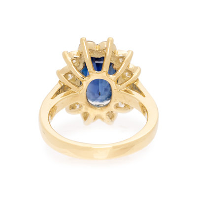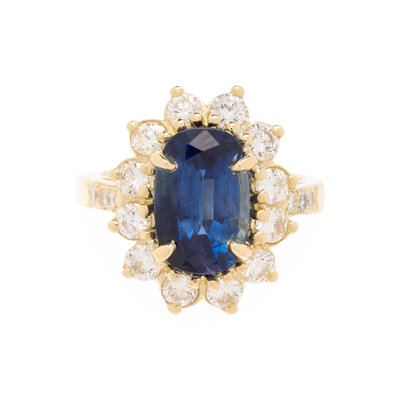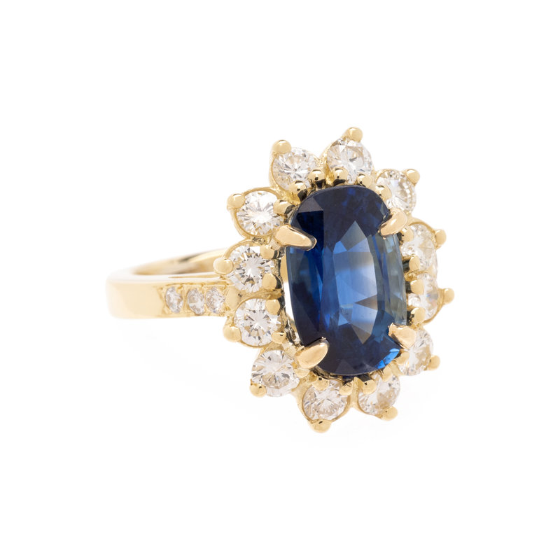 Containing one cushion mixed cut sapphire measuring 11.29 x 7.33 x 5.71 mm and 18 round brilliant cut diamonds weighing approximately 1.80 carats total. Mounted in yellow gold. Ring size 5 3/4.