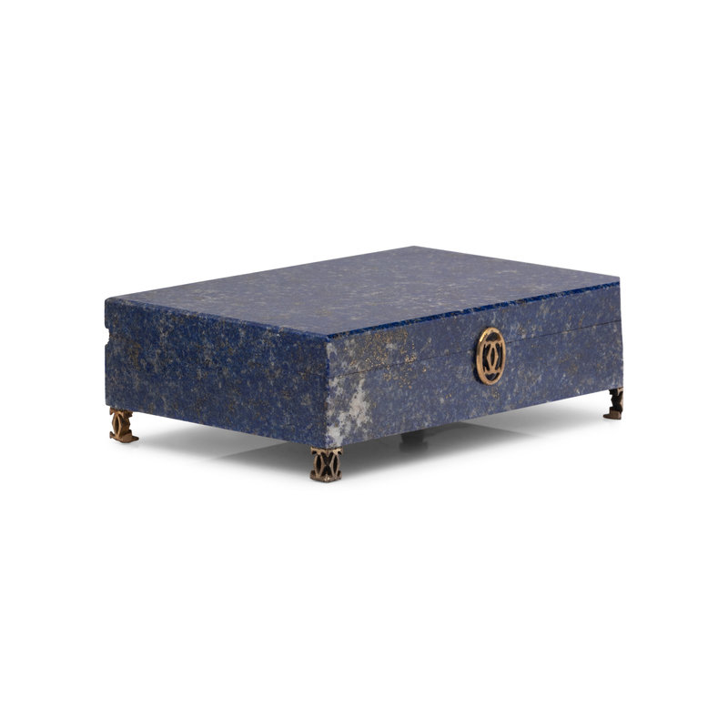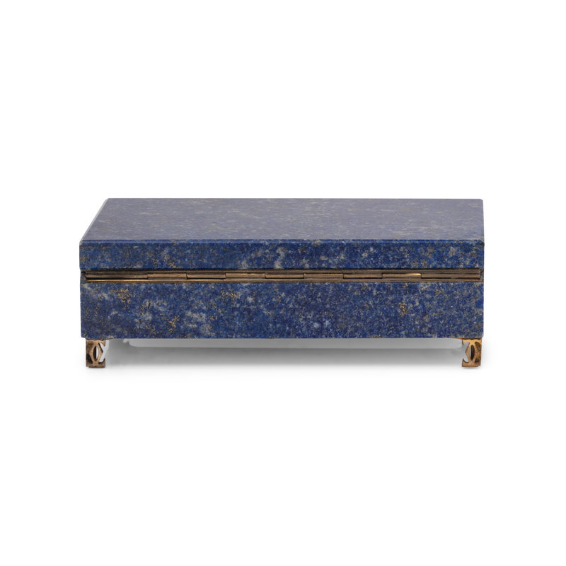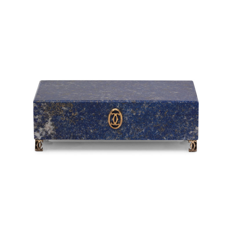 Consisting of a hinged lapis lazuli box with silver-gilt logo clasp, the interior with hardstone and silver-gilt fittings. 4 x 5 3/4 x 1 3/4 inches.