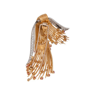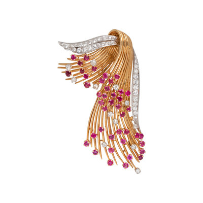 KUTCHINSKY, VINTAGE, YELLOW GOLD, DIAMOND AND RUBY BROOCH