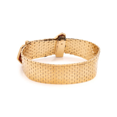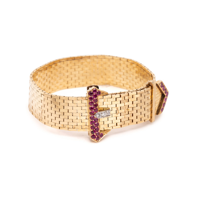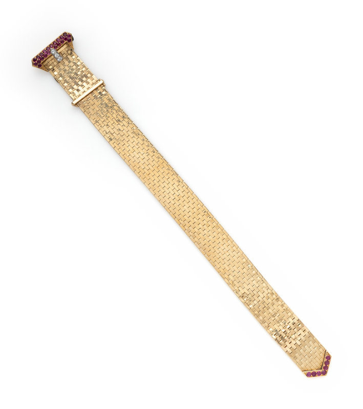 TIFFANY & CO., RETRO, YELLOW GOLD, RUBY AND DIAMOND BELT MOTIF BRACELET