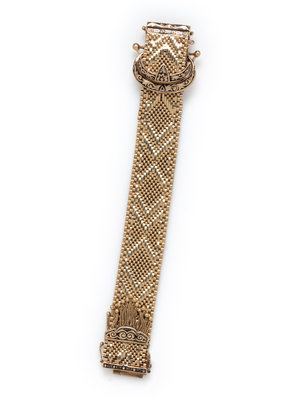 Consisting of a mesh link bracelet measuring approximately 21.00 mm wide, with a belt motif clasp and finial accented with black enamel and wheat chain tassels, the hinged cover concealing a watch with 17 jewel manual wind movement. 6 1/2 inches long.
