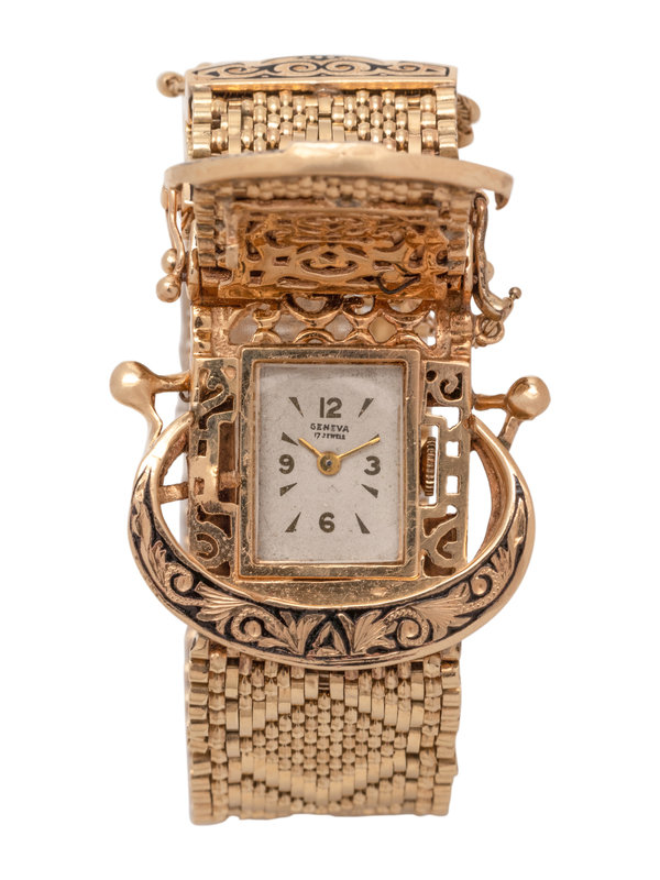 YELLOW GOLD AND ENAMEL BELT MOTIF SURPRISE WRISTWATCH