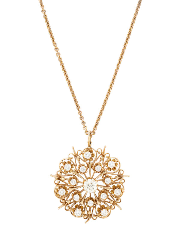Consisting of a pendant/brooch containing one old European cut diamond weighing approximately 1.00 carat and 14 round brilliant cut diamonds weighing approximately 1.60 carats total, suspended from a cable link chain. 14 1/2 inches long. Pendant/brooch: 1 1/2 inches wide.
