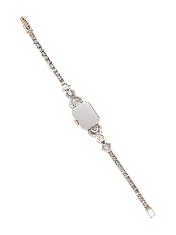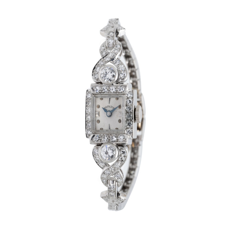 13.00 x 14.00 mm case dimensions, the bezel, lugs and bracelet containing two round brilliant cut diamonds weighing approximately 0.60 carat total and numerous single cut diamonds, off white dial, applied dot, dagger and pyramidal numerals, 17 jewel manual wind movement signed HAMILTON U.S.A., flexible link bracelet, fold over clasp. 6 1/4 inches long.