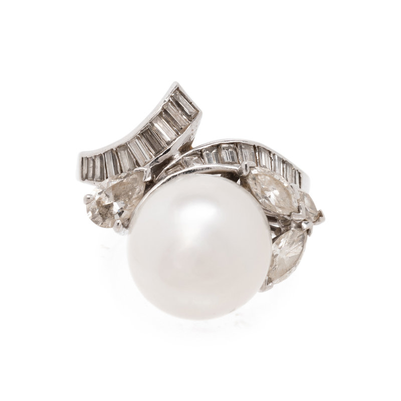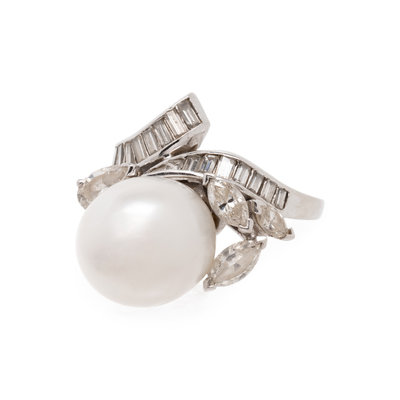 Containing one Baroque South Sea pearl measuring approximately 16.50 x 11.70 mm, three marquise, one pear and 19 baguette cut diamonds weighing approximately 1.50 carats total. Mounted in platinum. Ring size 4 1/4.