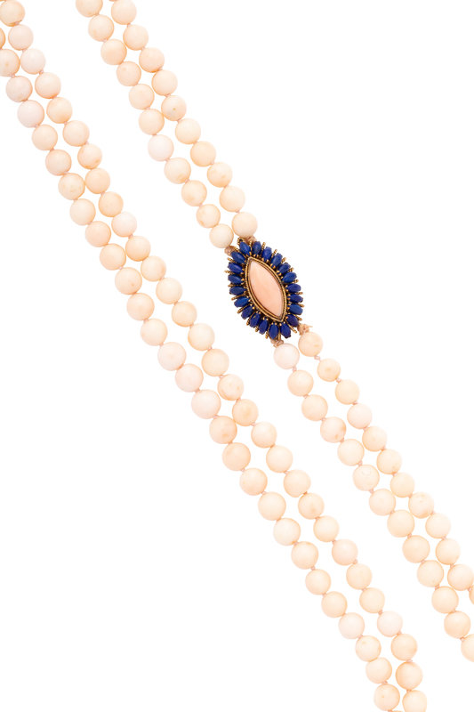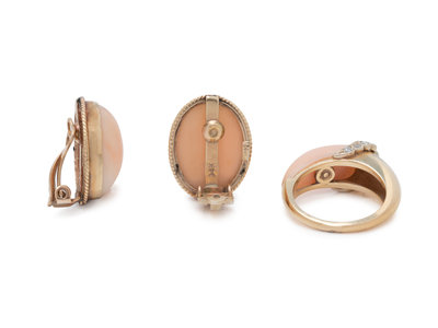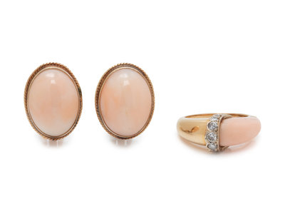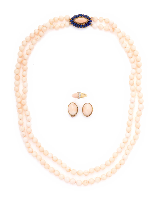 Consisting of a double strand necklace with angel skin coral beads and coral and lapis lazuli clasp, a Herbert Rosenthal angel skin coral and diamond ring, together with a pair of oval cabochon angel skin coral earclips. Necklace: 25 1/2-26 1/2 inches long. Ring size 5 3/4. Earclips: 3/4 inch long.