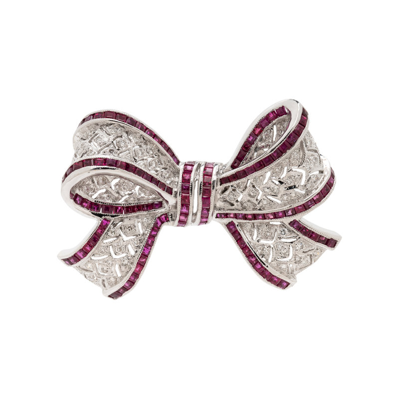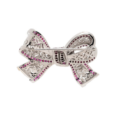 Containing 42 round brilliant cut diamonds and numerous square step cut rubies. Mounted in white gold. 1 inch x 1/2 inches.