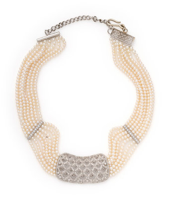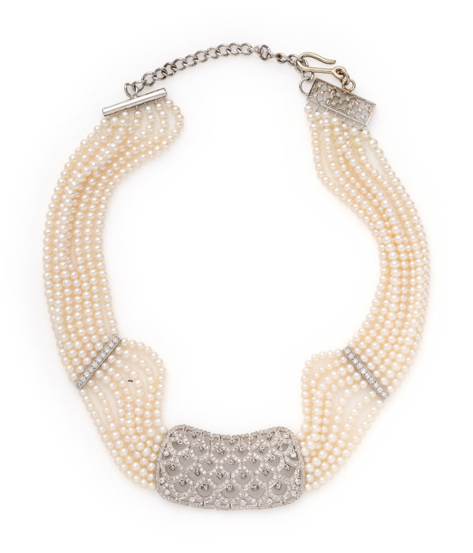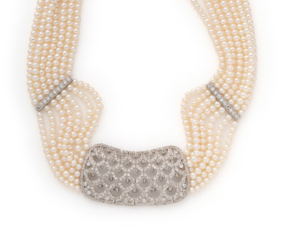 Consisting of seven strands of pearls measuring approximately 3.00 mm in diameter with white gold spacer bars, clasp and central section containing numerous round brilliant cut diamonds weighing approximately 3.00 carats total, with adjustable clasp. 15-18 inches long.