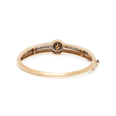 YELLOW GOLD, CULTURED PEARL, DIAMOND AND ENAMEL BANGLE BRACELET