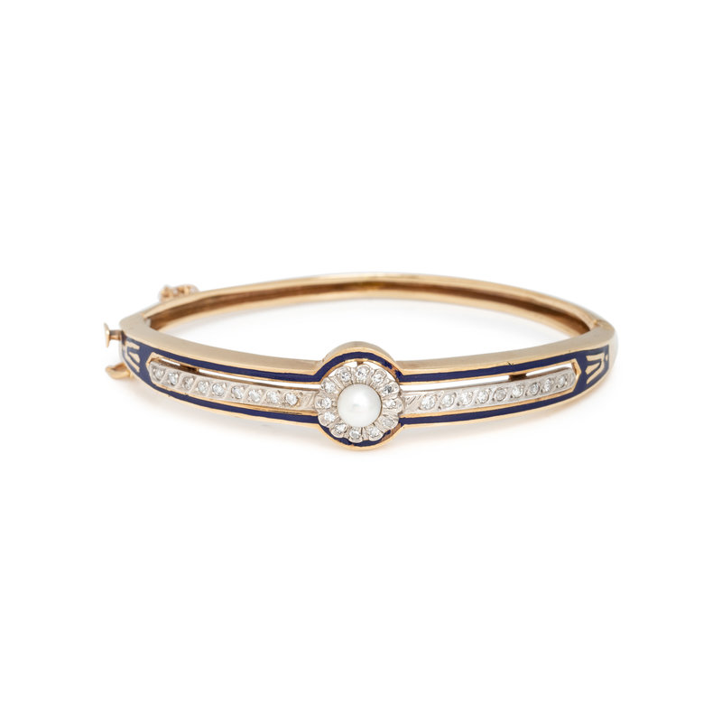 Containing one pearl and numerous single cut diamonds with a blue enamel surround, hinged with side clasp. 6 inches inner circumference.