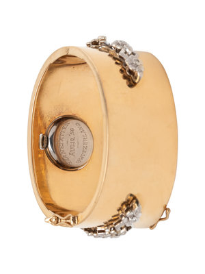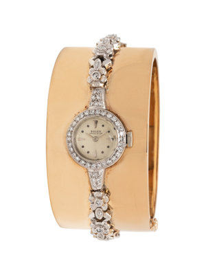 Consisting of a platinum Rolex watch with 17.00 mm case diameter, the bezel and bracelet containing numerous single cut diamonds, 17 jewel manual wind movement signed ROLEX SWISS, personalized case back, attached to a yellow gold bangle bracelet, hinged with side clasp. 5 3/8 inches inner circumference.