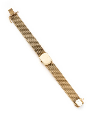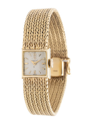 14.00 x 13.00 mm case dimensions, matte silvered dial, applied gold dagger and baton numerals, 17 jewel manual wind movement signed OMEGA WATCH Co SWISS, integrated mesh link bracelet, box clasp with Omega logo. 6 3/4 inches long.