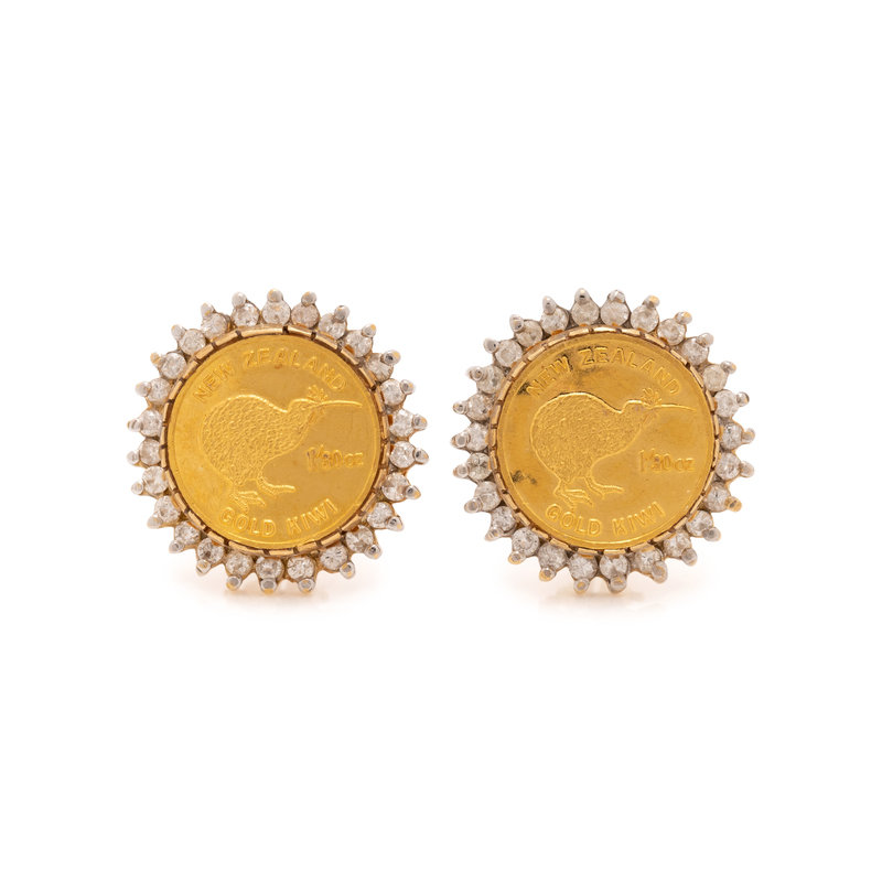 Containing two New Zealand 1/30 oz. gold coins and 52 round brilliant cut diamonds weighing approximately 0.75 carat total, posts with clip backs. 3/4 inch long.
