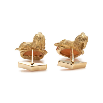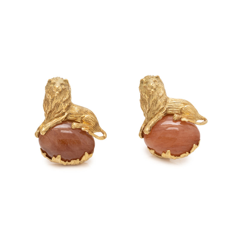 Consisting of two yellow gold lions sitting on two oval cabochon hardstones. 1 x 3/4 inch.