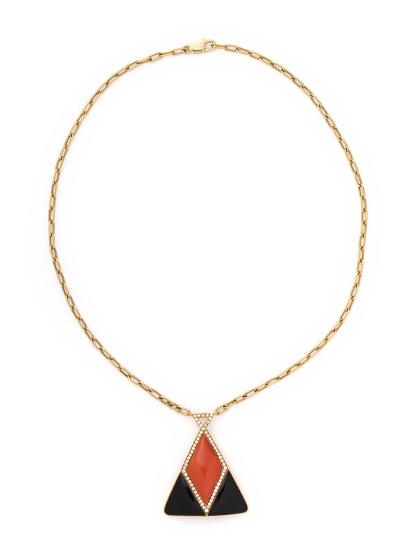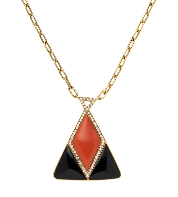 Consisting of a pendant containing 61 round brilliant cut diamonds weighing approximately 1.25 carats total, a navette shaped coral plaque measuring approximately 36.00 x 19.60 mm and two triangular onyx plaques measuring approximately 24.45 x 23.65 mm, attached to an oval link chain. 23 inches long.