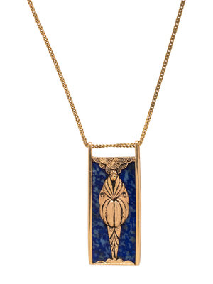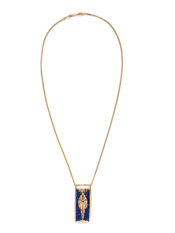 Consisting of a pendant with rectangular lapis lazuli plaque and gold figure, suspended from a curb link chain. 20 inches long.