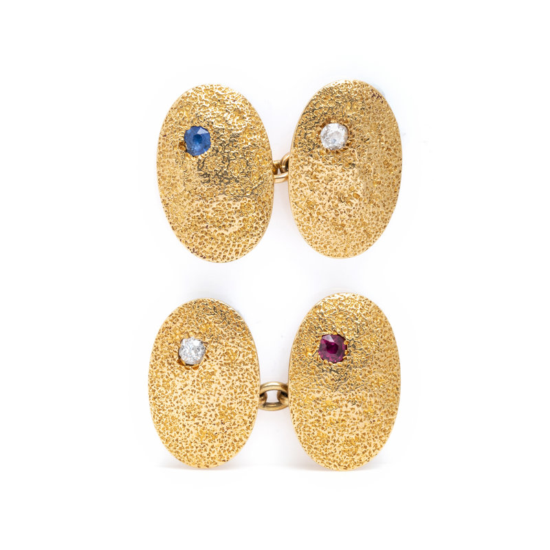 Consisting of textured gold cufflinks containing two old European cut diamonds, one round mixed cut sapphire and one cushion mixed cut ruby. 13/16 x 1/2 inch.