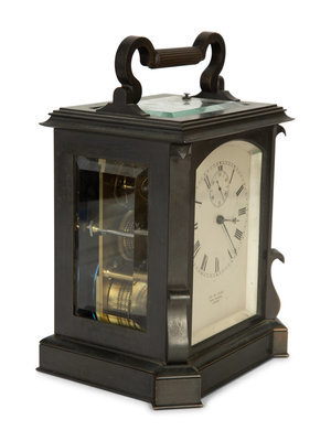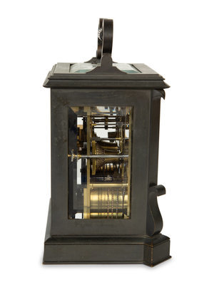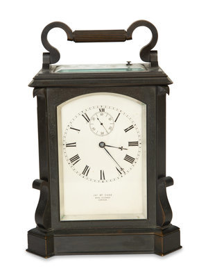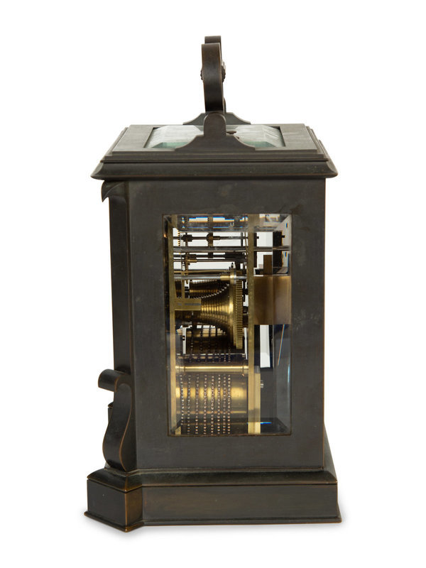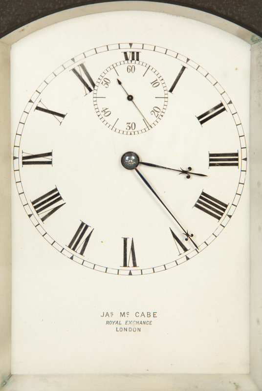The moulded bronze case surmounted by a hinged handle and inset with bevelled crystal panels, solid rear door with shuttered holes for winding, hand-set, regulation and strike/silent. The silvered dial is signed "Jas Mc Cabe / Royal Exchange / London". Accompanied by a numbered winding key.