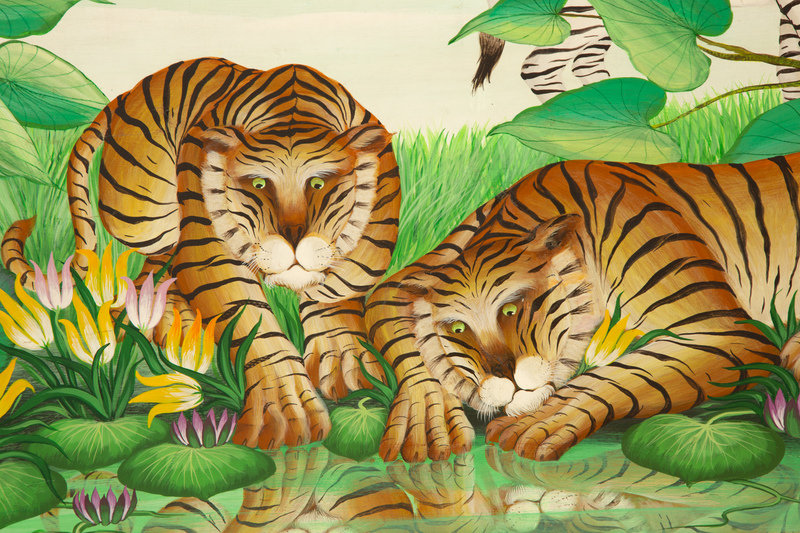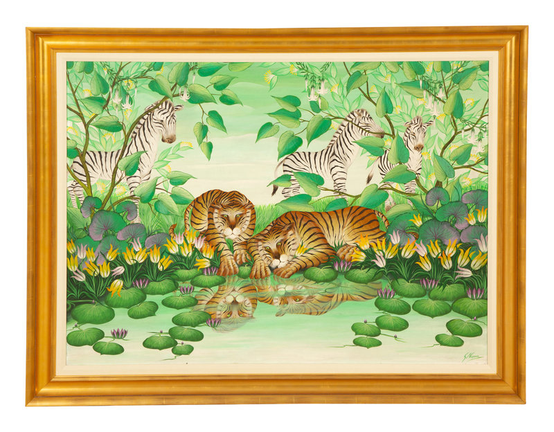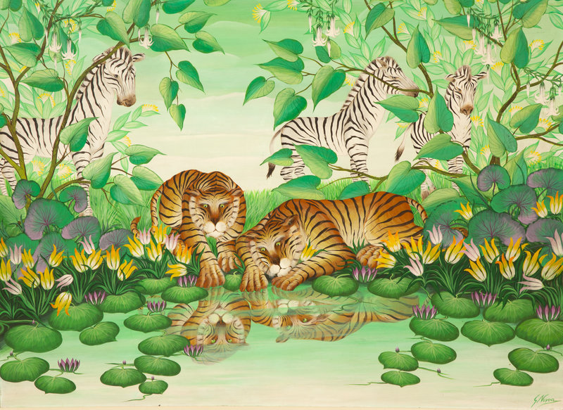 Zebras and Tigers Gathering by a Lily Pond