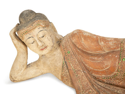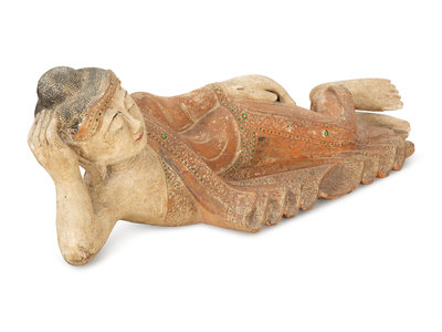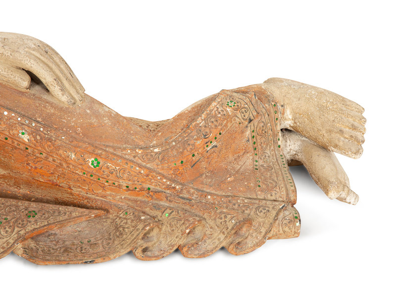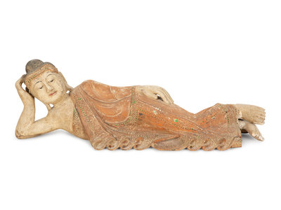 A South-East Asian Carved and Painted Wood Sculpture of a Reclining Buddha