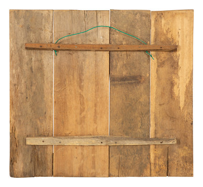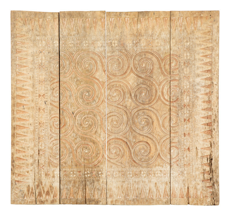 comprising a Balinese four-section panel with geometric design; a smaller 3-D carved panel; and a carved and painted frieze with figures of buddhas under the tree of life.