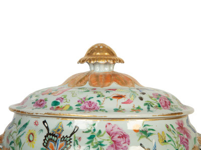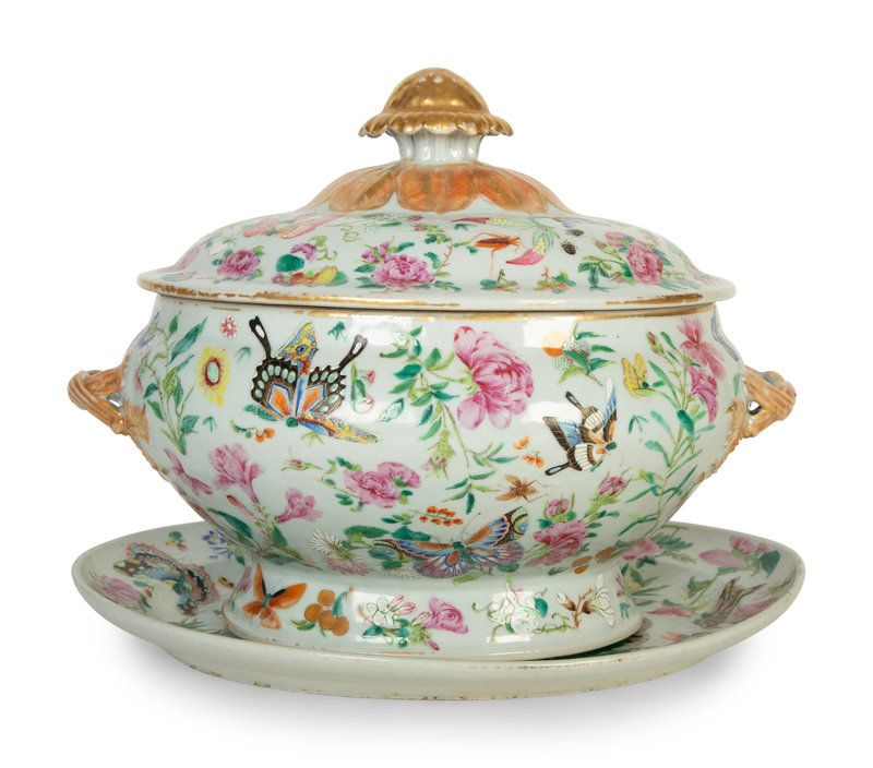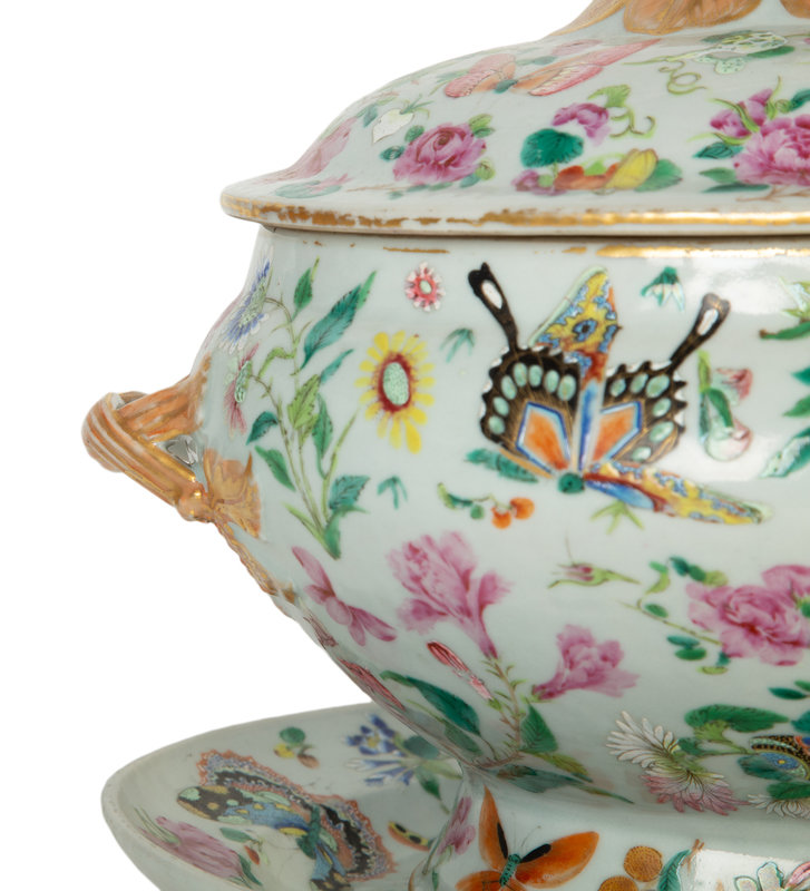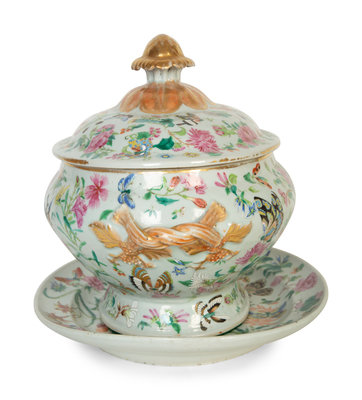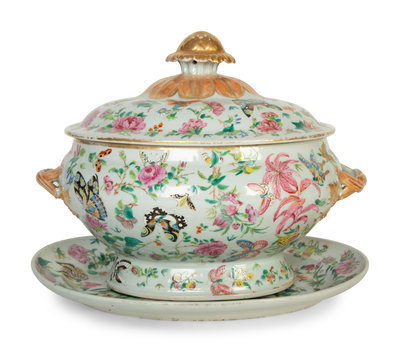 A Chinese Export Famille Rose Porcelain Covered Tureen and Underplate