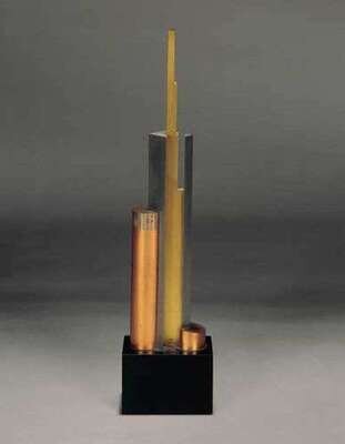 stainless steel, copper, brass, signed with etched initials 'JS' on base of sculpture, indistinctly number, on a black slate base
